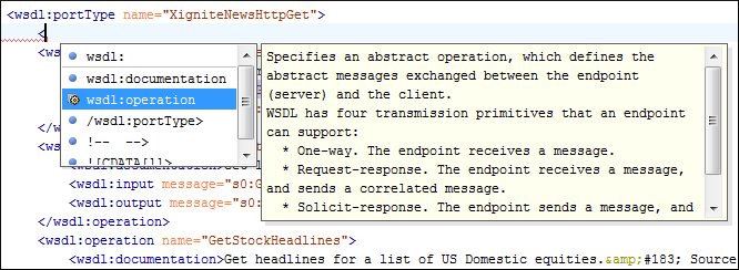 The Content Completion Assistant is a powerful feature that enhances the editing of WSDL documents. It helps you define WSDL components by proposing context-sensitive element names. It can be manually activated with the Ctrl + Space shortcut.
