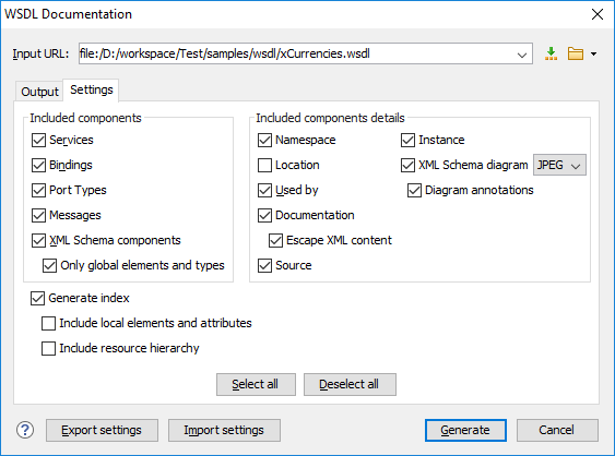 - XML Schema Components - Specifies whether or not the generated documentation includes the XML Schema components.