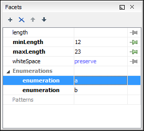 The default value of a facet is rendered in the Facets view with a blue color. The facets that can not be edited are rendered with a gray color. The grouping categories (for example: Enumerations and Patterns) are not editable. If these categories contain at least one child they are rendered with bold. Bold facets are facets with values set explicitly to them.