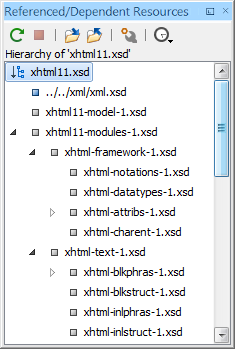 The Referenced/Dependent Resources is useful when you want to start from an XML Schema (XSD) file and build and review the hierarchy of all the other XSD files that are imported, included or redefined in the given XSD file. The view is also able to build the tree structure, that is the structure of all other XSD files that import, include or redefine the given XSD file. The scope of the search is configurable (the current project, a set of local folders, etc.)