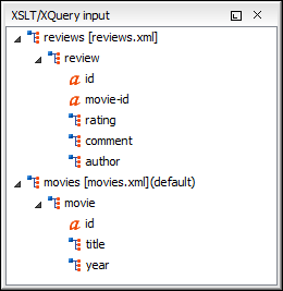 The structure of the source documents of an edited XQuery is displayed in a tree form in a view called the XQuery Input view. If the view is not displayed, it can be opened by selecting it from the menu. The tree nodes represent the elements of the documents.