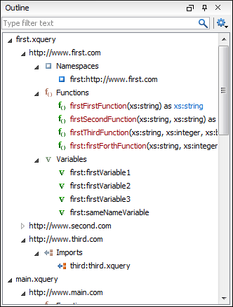 - Allows you to group the components by location, namespace, and type. When grouping by namespace, the main XQuery module namespace is presented first in the Outline view.