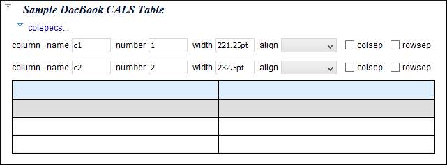 When you insert a CALS table, you see a link for setting the <colspecs>