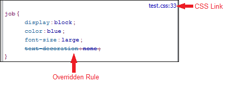 All rules that apply to the current element are displayed in sections, which are listed in order of importance (from most specific to least specific). Rules that are overridden by other rules are crossed out. If you click the link in the top-right corner of a rule Oxygen XML Editor Eclipse plugin opens the associated CSS file at the line number where the properties of the rule are defined.