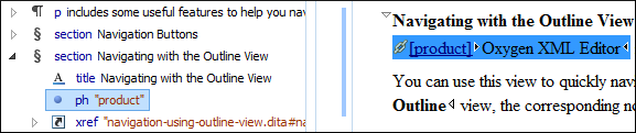 You can use this view to quickly navigate through the current document by selecting nodes in the outline tree. It is synchronized with the editor area, so when you make a selection in the Outline view, the corresponding nodes are highlighted in the editor area.