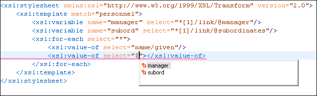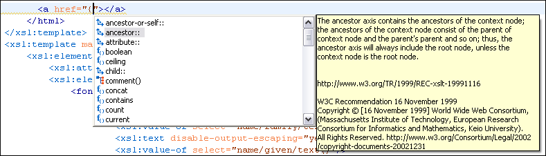 - The XPath Content Completion Assistant automatically displays a pop-up window with all the XSLT axes, XPath functions and elements and attributes from the XML input document that can be inserted in the current context.