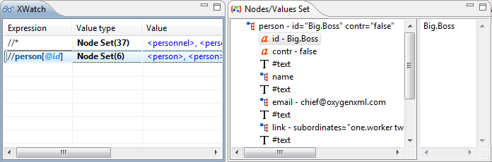 - If the expression result type is a Node Set, click it (Value column) and its value is displayed in the Nodes/Values Set view.