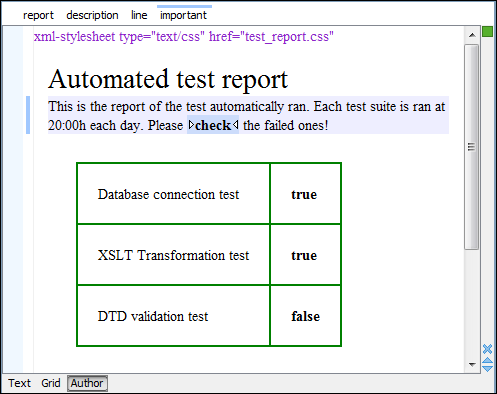 Based on the XML Schema and CSS file Oxygen XML Editor Eclipse plugin can help the content author in loading, editing, and validating the test reports. An XML document template must be created as a kind of skeleton that the users can use as a starting point for creating new test reports. The template must be generic enough and reference the XML Schema file and the CSS stylesheet.