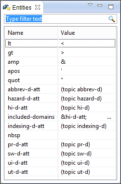 Double-clicking one of the entities will insert it at the current cursor position in the XML document. You can also sort entities by name and value by clicking the column headers.
