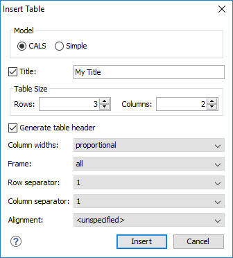 When you click Insert, a CALS table is inserted into your document at the current cursor position.