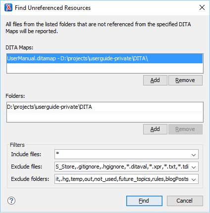 - Folders - Provides a list of folders to be included in the search and allows you to Add or Remove specific folders. All files from this list of folders that are not referenced from the maps specified in the DITA Maps list will be reported.