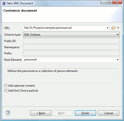 <xs:choice>schema element in the skeleton XML document. Oxygen XML Editor Eclipse plugin creates this document in a new editor panel when you click Finish.