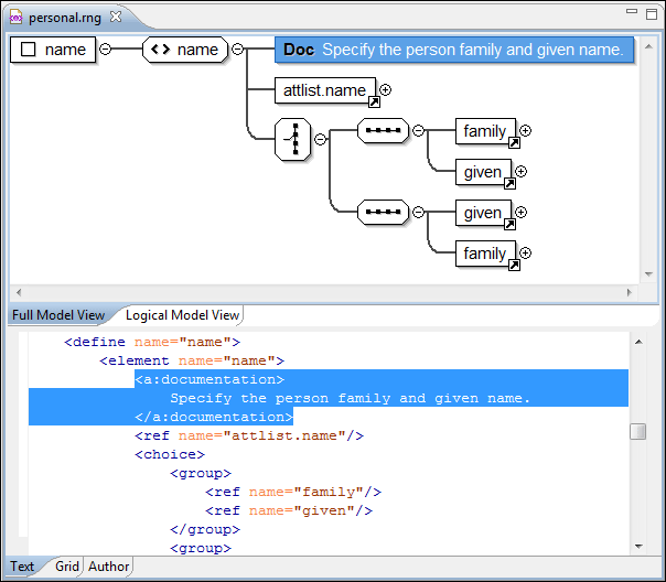 When you create a new schema document or open an existing one, the editor panel is divided in two sections: one containing the schema diagram and the second the source code. The schema diagram editor has two tabs that offer a Full Model View and Logical Model View.