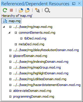The Referenced/Dependent Resources view displays the references or dependencies for resources included in an RNG schema. If the view is not displayed, it can be opened by selecting it from the menu.