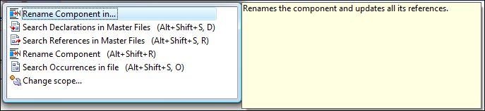 Declarations- Searches the declaration of the component in a predefined scope. It is available only when the context represents a component name reference.