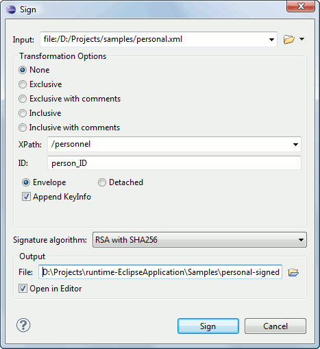 • Output - Available if the Sign action was selected from the XML Tools menu. Specifies the path of the output file where the signed XML document will be saved.