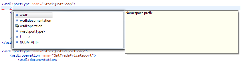The Content Completion Assistant is a powerful feature that enhances the editing of WSDL documents. It helps you define WSDL components by proposing context-sensitive element names. It can be manually activated with the Ctrl + Space shortcut.