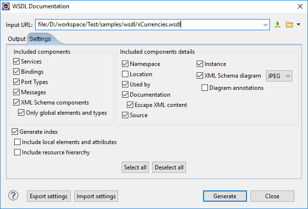 Figure 2. Settings Tab of the WSDL Documentation Dialog Box