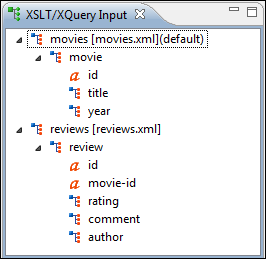 The structure of the source documents of an edited XQuery is displayed in a tree form in a view called the XQuery Input view. If the view is not displayed, it can be opened by selecting it from the menu. The tree nodes represent the elements of the documents.