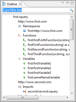 - Allows you to group the components by location, namespace, and type. When grouping by namespace, the main XQuery module namespace is presented first in the Outline view.