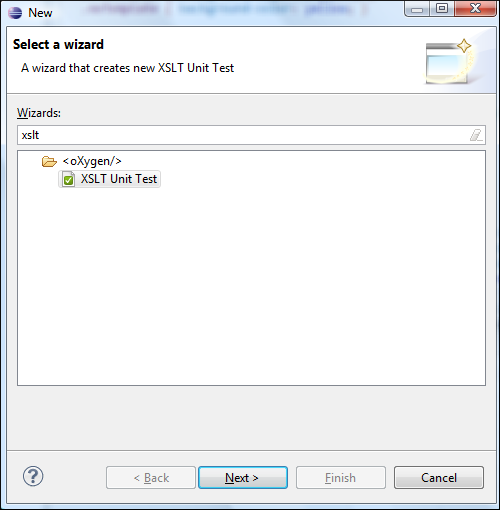 To create an XSLT Unit Test, go to . You can also create an XSLT Unit Test from the contextual menu of an XSL file in the Project Explorer view. Oxygen XML Editor Eclipse plugin allows you to customize the XSpec document when you create it. In the customization dialog box, you can enter the path to an XSL document or to a main XSL document.