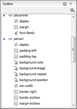 The Outline view for CSS stylesheets presents the import declarations for other CSS stylesheet files and all the selectors defined in the current CSS document. The selector entries can be presented as follows: