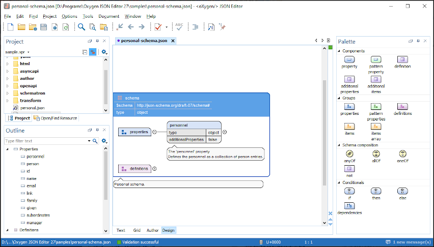 Oxygen JSON Editor includes several editing modes (Text, Grid, Author, and Design) and a large variety of helper views, menu actions, toolbars, and contextual menu functions.