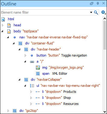 The Outline view for HTML documents displays the structure of the HTML document you are editing. By default, it is displayed on the left side of the editor. In addition to the normal features available in the Outline view for XML documents, the HTML Outline view also handles void elements, elements that are not closed, or attributes without quotes, and presents the tree structure of the HTML document correctly.
