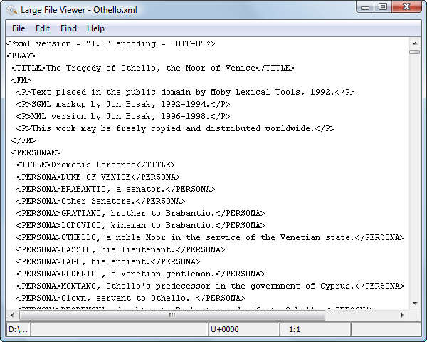The powerful Large File Viewer is available from the Tools menu or as a standalone application. You can also right-click a file in your project and choose to open it with the viewer. It uses an efficient structure for indexing the open document. No information from the file is stored in the main memory, just a list of indexes in the file. In this way the viewer can open very large files, up to 10 gigabytes. If the open file is XML, the encoding used to display the text is detected from the XML prolog of the file. For other file types, the encoding is taken from the Oxygen JSON Editor options. See Encoding for non-XML files.