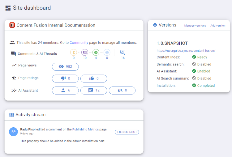 - This pane displays the activity for the particular site, including information about the person who made the change and details about each activity. Topic titles are displayed as links that navigate to the particular output page. You can click on the version badge to the far right to open the Comments page where you can manage the comments added by users for that version.