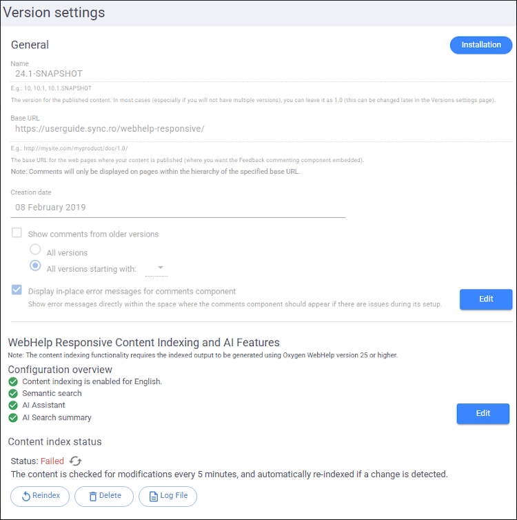 Use this option to enable/disable content indexing and to configure search functions. When content indexing is enabled for a site's version, the corresponding WebHelp Responsive output will use Oxygen Feedback as the search engine when users search the published content. If content indexing is disabled, the search will be performed using the JS Search Engine bundled in the WebHelp Responsive output.
