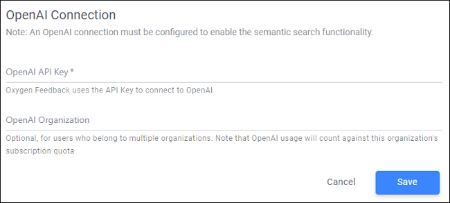 The semantic search functionality requires that you configure Oxygen Feedback Enterprise to connect to OpenAI™ on your behalf.