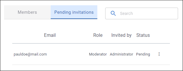- Click the Invite button. An email is sent to the new member and they will be listed in the Pending Invitations tab until they accept the invitation. Also in the Pending Invitations tab, you can click the vertical ellipsis to the far right of the user's name to access actions to Resend invition or Delete invition (this will delete the current invitation even if the user has received the link).