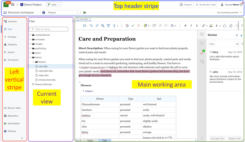 The main working area contains the visual editor along with its additional helper side views. In the image above, the topic highlighted in the Files view is open in the visual editor and the Review side view is open.