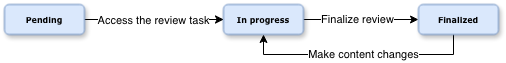 Each reviewer also has an individual reviewer status when reviewing a task. Before a reviewer opens the task, the status is Pending. After the reviewer starts working in the task, the status changes to In progress. When the reviewer finishes, they can use Finalize my review, which changes the individual reviewer status to Finalized. If the reviewer makes more changes after finalizing, the status changes back to In progress. If a task owner starts a new review cycle, the individual reviewer status is reset for all reviewers.