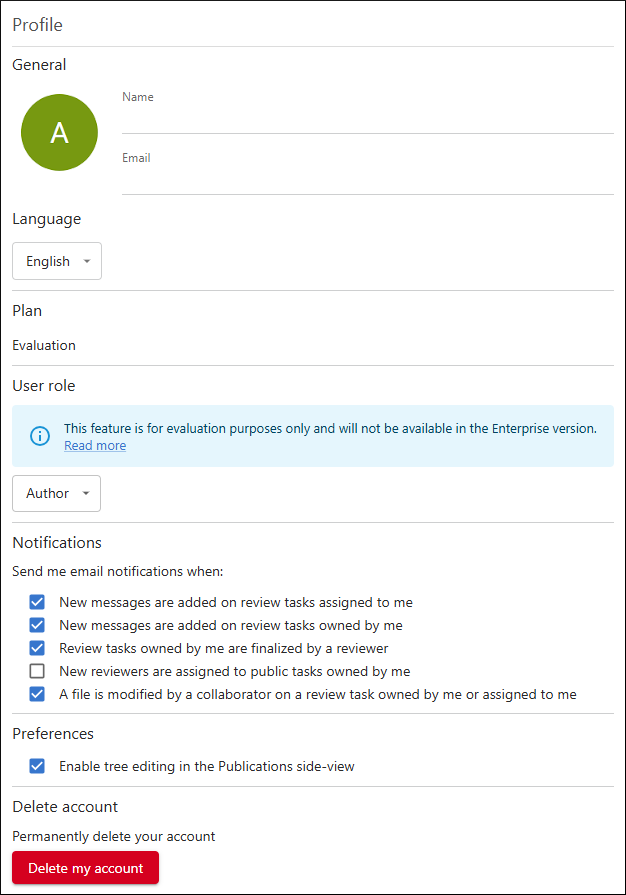 If you click your user name in the top-right corner of the Oxygen Content Fusion interface, a drop-down menu appears. From this menu, select Profile to access the profile settings page. It displays information about your name, email, avatar, and allows you to delete your account or specify which types of notifications will be sent to you via email.
