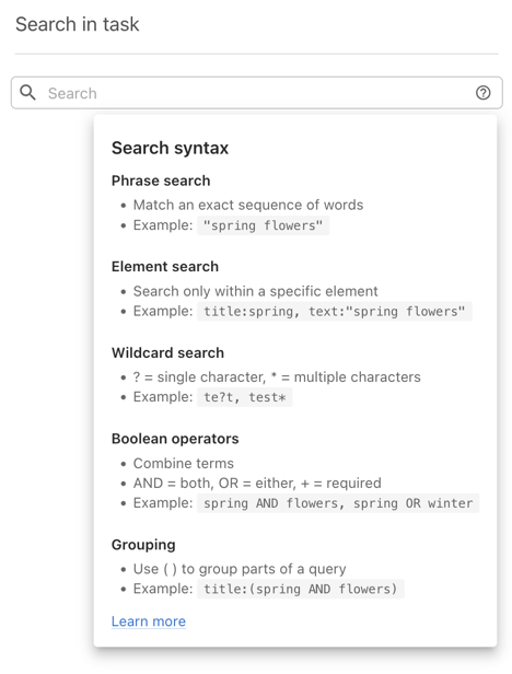 How to use advanced query syntax to build more precise searches across task files.