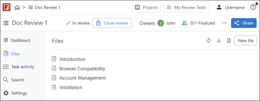 Use the Files view in a review task to open the task files, see who is working in them, upload or create new files, and download the task content.