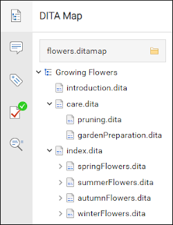 Presents a DITA map as a hierarchical tree. The pane is automatically displayed (collapsed, by default) when you open a DITA map in the editor.