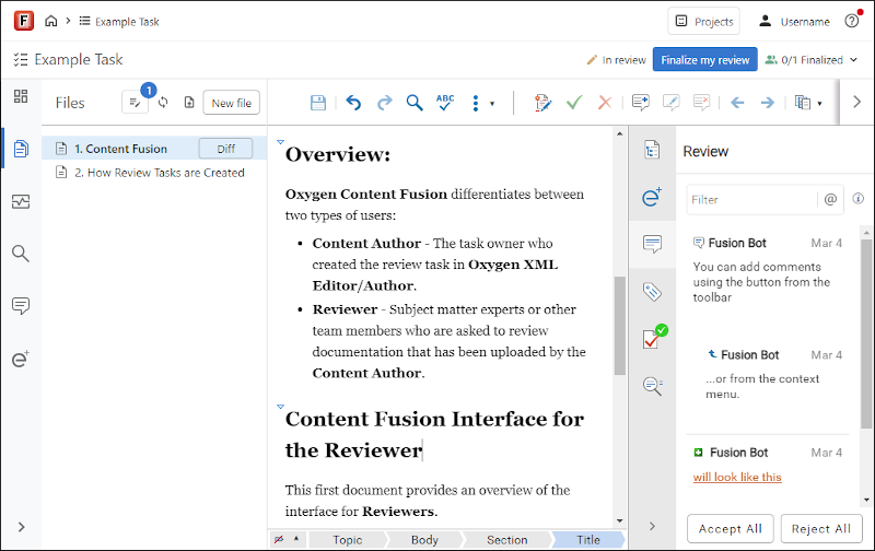When you click a file in a review task, it opens in the Oxygen Content Fusion visual editor. Reviewers use the editor to proofread content, suggest changes, and add comments. Task owners can also use the editor to review proposed changes, manage comments, and make their own edits. For example, a task owner can accept or reject reviewer changes, add new comments, reply to existing comments, or edit the document directly in the browser interface.