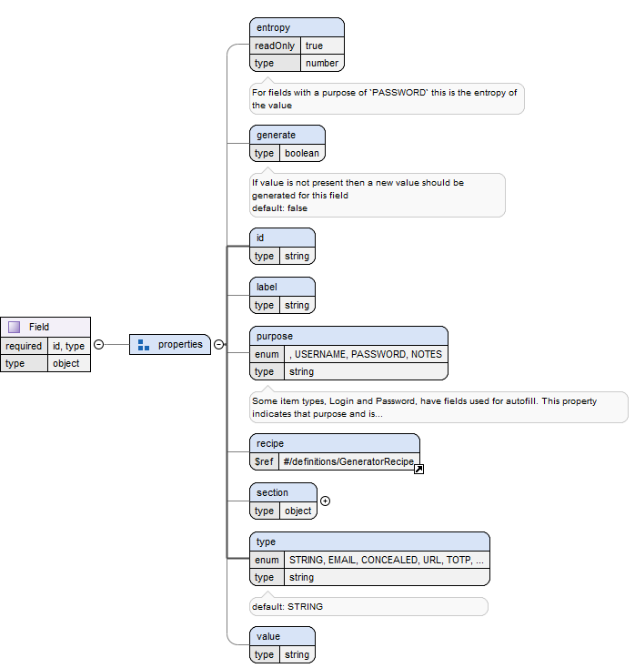 "Field":{"type":"object","required":["id","type"],"properties":{"entropy":{"type":"number","description":"For fields with a purpose of `PASSWORD` this is the entropy of the value","readOnly":true},"generate":{"description":"If value is not present then a new value should be generated for this field","default":false,"type":"boolean"},"id":{"type":"string"},"label":{"type":"string"},"purpose":{"description":"Some item types, Login and Password, have fields used for autofill. This property indicates that purpose and is required for some item types.","type":"string","enum":["","NOTES","PASSWORD","USERNAME"]},"recipe":{"$ref":"#/definitions/GeneratorRecipe"},"section":{"type":"object","properties":{}},"type":{"default":"STRING","type":"string","enum":["TOTP","DATE","MONTH_YEAR","CONCEALED","STRING","MENU","EMAIL","URL"]},"value":{"type":"string"}}}