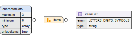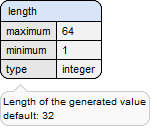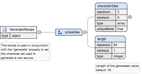 "GeneratorRecipe":{"type":"object","description":"The recipe is used in conjunction with the \"generate\" property to set the character set used to generate a new secure value","properties":{"characterSets":{"type":"array","uniqueItems":true,"minimum":0,"maximum":3,"items":{}},"length":{"type":"integer","minimum":1,"maximum":64,"description":"Length of the generated value","default":32}}}
