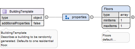 "BuildingTemplate":{"type":"object","additionalProperties":false,"title":"BuildingTemplate","description":"Describes a building to be randomly generated. Defaults to one residential floor.","properties":{"Floors":{"type":"array","minItems":1,"maxItems":1,"title":"Floors","default":[{"Floorplan":{"Footprint":{"DesiredAspectRatio":{"x":1,"y":1}},"Ceiling":{"Height":3},"Rooms":[{"Type":"Living","Name":"My_Living_Room","OriginalName":"My Living Room","DesiredShape":{"Area":20,"AspectRatio":{"x":1,"y":1}}}],"DesiredConnections":[]},"Interior":{"Doorways":{"DoorwaySets":[]},"Flooring":{"MaterialSets":[]},"Walls":{"MaterialSets":[]},"Furniture":{"FurnitureArrangements":[]}}}],"items":{}}}}