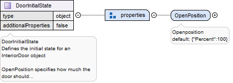 "DoorInitialState":{"type":"object","additionalProperties":false,"title":"DoorInitialState","description":"Defines the initial state for an InteriorDoor object\n\nOpenPosition specifies how much the door should be open.","properties":{"OpenPosition":{"title":"Openposition","default":{"Percent":100},"allOf":[{"$ref":"#/definitions/DoorOpenPosition"}]}}}