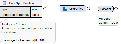 "DoorOpenPosition":{"type":"object","additionalProperties":false,"title":"DoorOpenPosition","description":"Defines the amount of openness of an InteriorDoor.\n\nThe range for Percent is [0., 100.]","properties":{"Percent":{"title":"Percent","default":100,"anyOf":[{"type":"number","minimum":0,"maximum":100},{"type":"string","const":"Random"}]}}}
