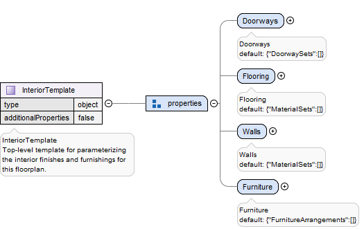 "InteriorTemplate":{"type":"object","additionalProperties":false,"title":"InteriorTemplate","description":"Top-level template for parameterizing the interior finishes and furnishings for\nthis floorplan.","properties":{"Doorways":{"title":"Doorways","default":{"DoorwaySets":[]},"allOf":[{"$ref":"#/definitions/InteriorDoorways"}]},"Flooring":{"title":"Flooring","default":{"MaterialSets":[]},"allOf":[{"$ref":"#/definitions/InteriorFlooring"}]},"Walls":{"title":"Walls","default":{"MaterialSets":[]},"allOf":[{"$ref":"#/definitions/InteriorWalls"}]},"Furniture":{"title":"Furniture","default":{"FurnitureArrangements":[]},"allOf":[{"$ref":"#/definitions/InteriorFurnishings"}]}}}