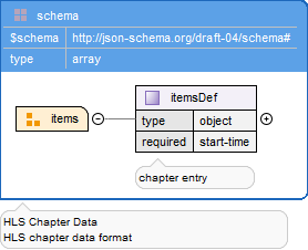 {"type":"array","title":"HLS Chapter Data","description":"HLS chapter data format","$schema":"http://json-schema.org/draft-04/schema#","items":{"type":"object","description":"chapter entry","required":["start-time"],"properties":{"chapter":{"type":"number","minimum":1,"description":"Chapter number (optional)"},"start-time":{"type":"number","minimum":0,"description":"Chapter start time"},"duration":{"type":"number","minimum":0,"exclusiveMinimum":true,"description":"Chapter duration (optional)"},"titles":{"type":"array","description":"List of titles by language for chapter (optional)","items":{"type":"object","description":"Title object","required":["language","title"],"properties":{"language":{"type":"string","description":"BCP 47 language code; und for undefined"},"title":{"type":"string","description":"Chapter title string"}}}},"images":{"type":"array","description":"List of images for chapter (optional)","items":{"type":"object","description":"Image object","required":["image-category","pixel-width","pixel-height","url"],"properties":{"image-category":{"type":"string","description":"Image category"},"pixel-width":{"type":"integer","minimum":0,"exclusiveMinimum":true,"description":"Pixel width"},"pixel-height":{"type":"integer","minimum":0,"exclusiveMinimum":true,"description":"Pixel height"},"url":{"type":"string","description":"URL to image (relative or absolute)"}}}},"metadata":{"type":"array","description":"List of metadata entries for chapter (optional)","items":{"type":"object","description":"Metadata object","required":["key","value"],"properties":{"key":{"type":"string","description":"Key value name"},"value":{"description":"Metadata value","anyOf":[{"type":"string"},{"type":"number"},{"type":"boolean"},{"type":"array"},{"type":"object"}]},"language":{"type":"string","description":"BCP 47 language code (optional)"}}}}}}}