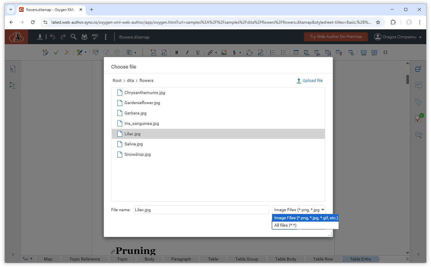 The file browser now filters available files based on your current task. When you insert images, maps, DITAVAL files, or other assets, you see only file types that are valid for that action. This helps you find the right files faster and avoid selecting incompatible resources during authoring.